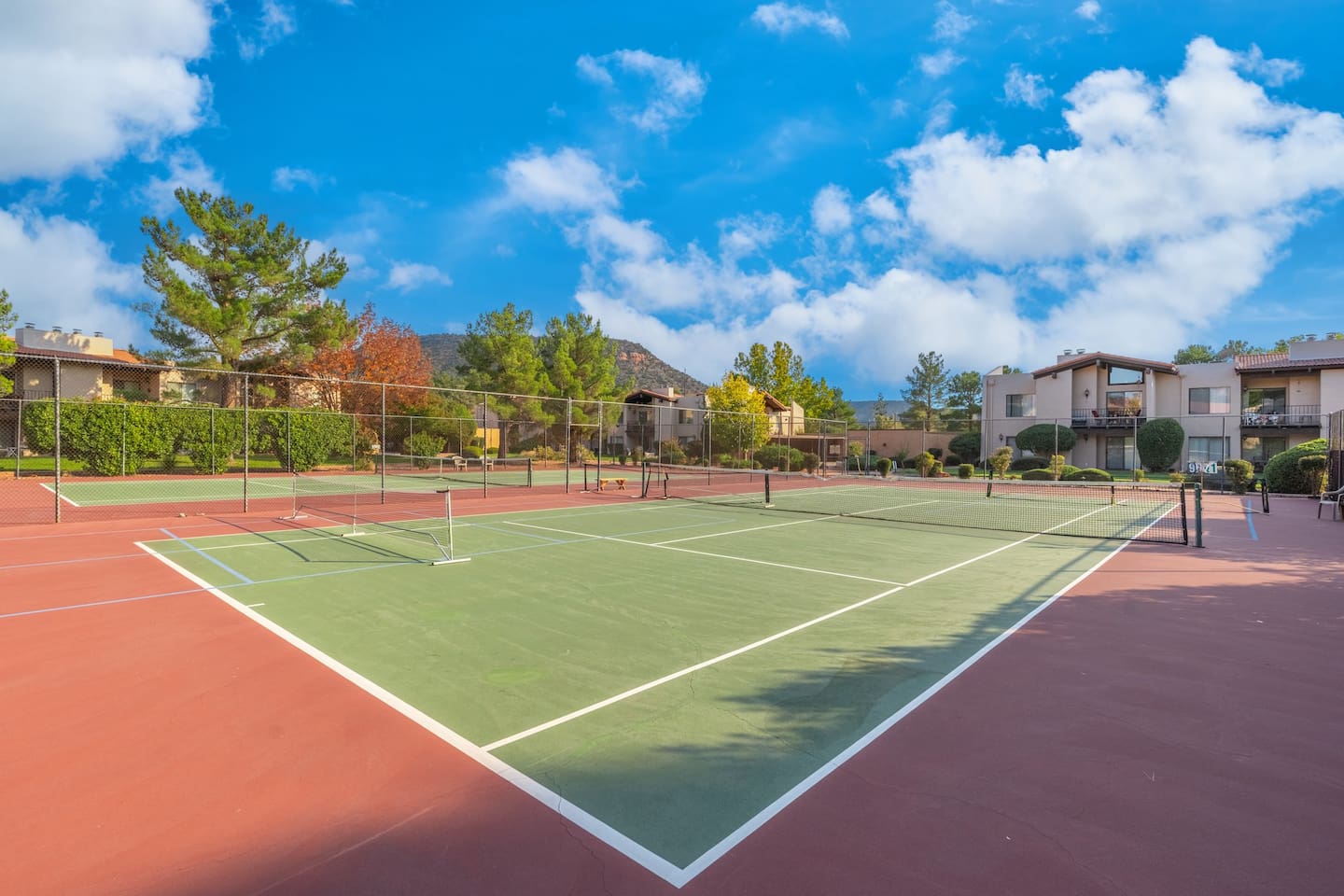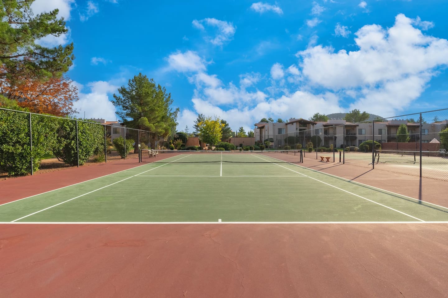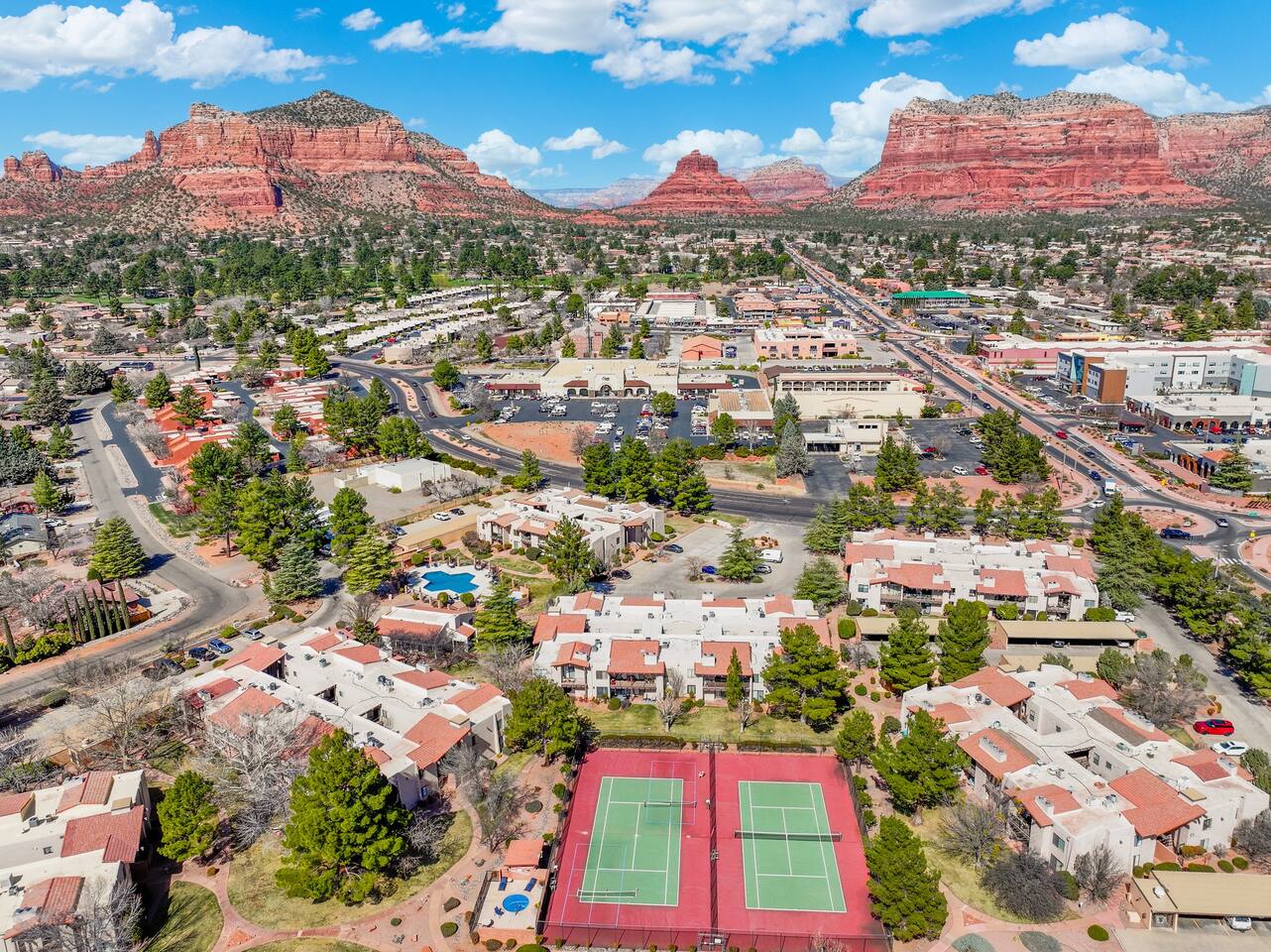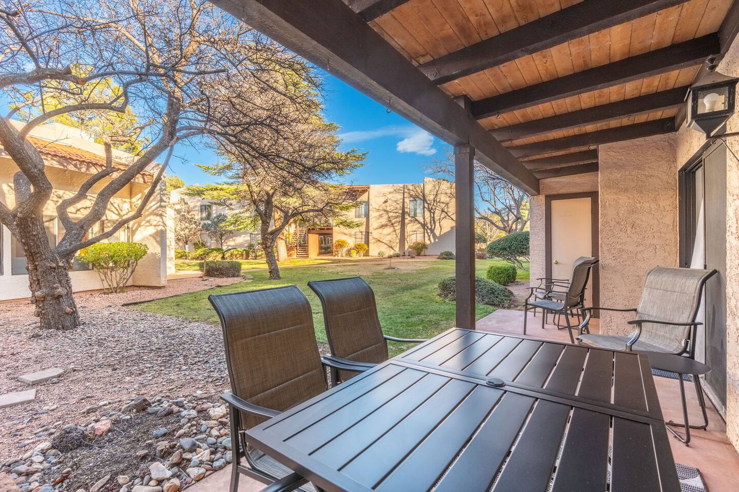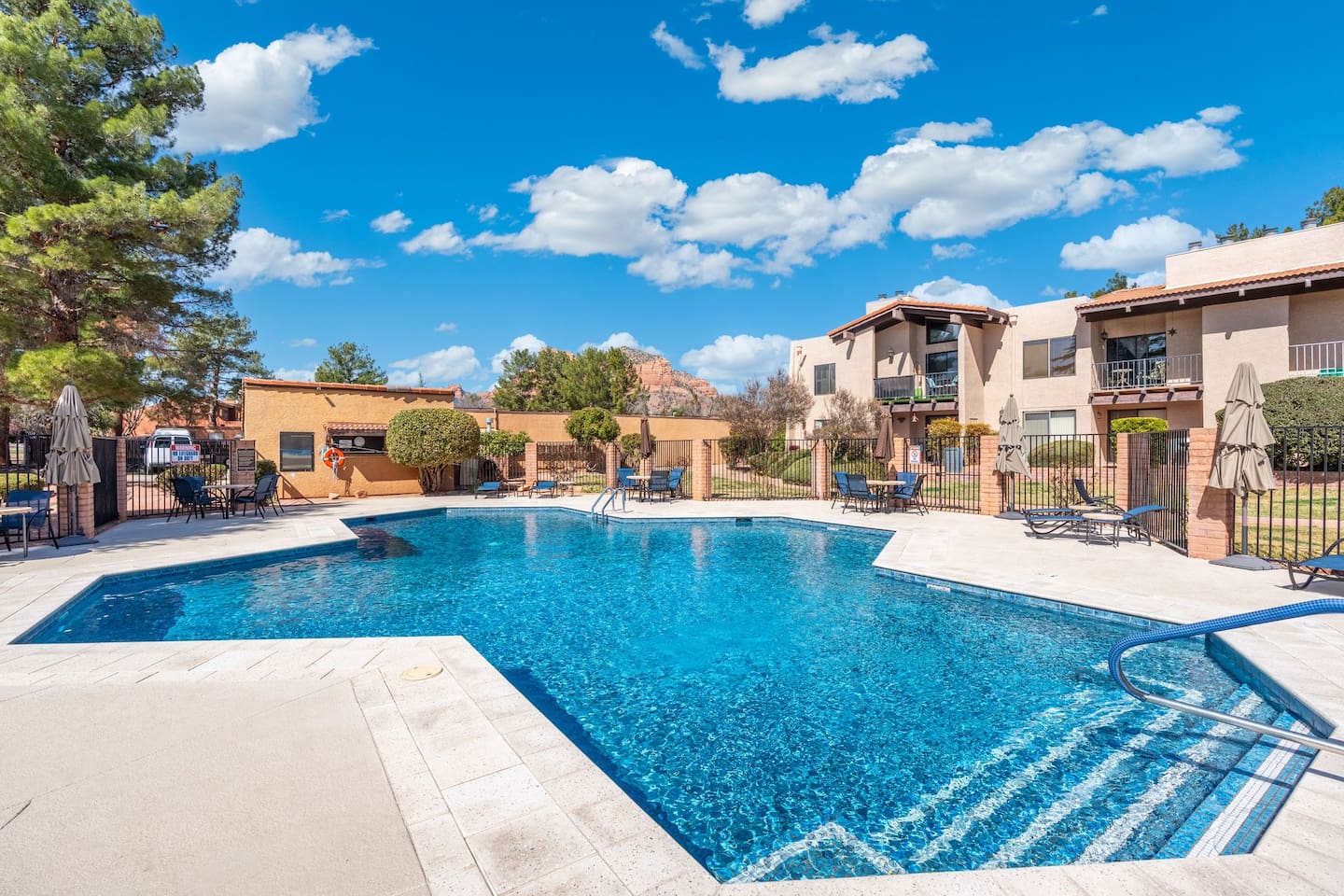 Enjoy modern comfort in this beautifully updated ground-floor 2BR/2BA condo in Sedona. The spacious living room features a queen pullout couch and opens to a private patio. Both bedrooms offer king beds with direct access to private baths. Community perks include a spa, pool, tennis & pickleball courts, and lush green space. You’re steps from the pool, and across from Sedona Vista Village shops and Clark’s Market. Ideal for those seeking convenience, relaxation, and access to nature nearby.