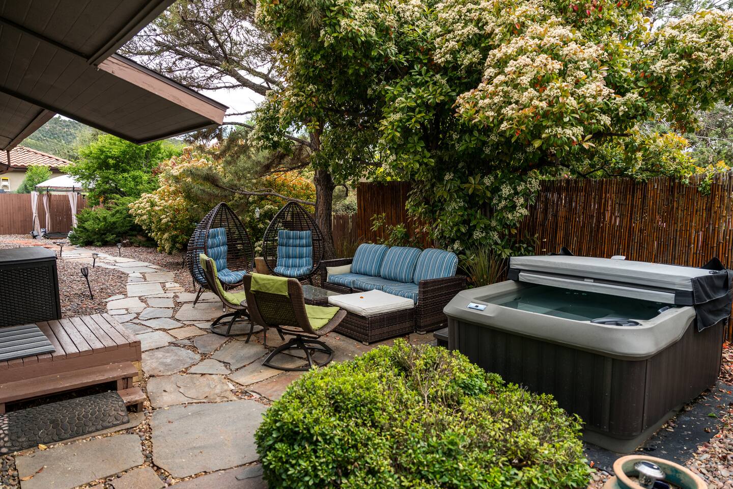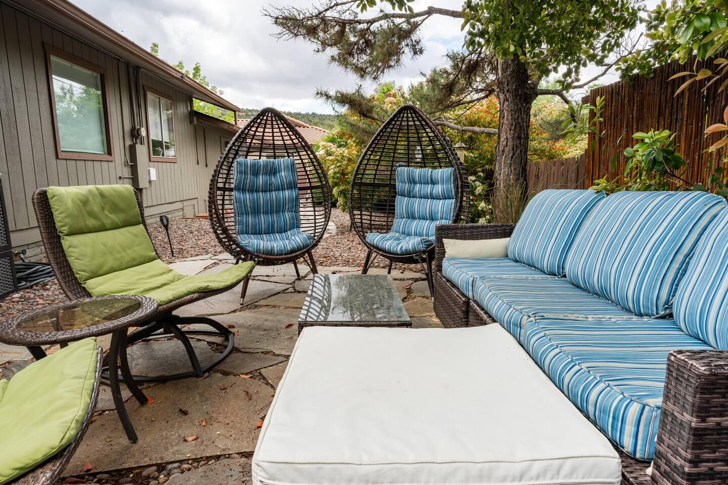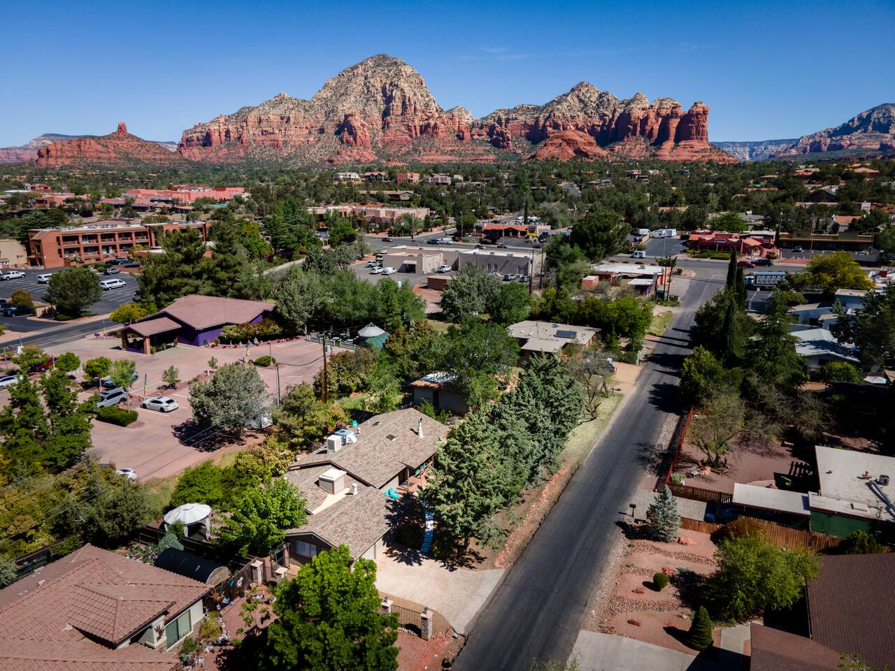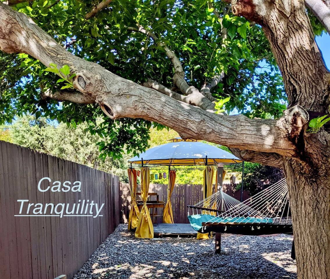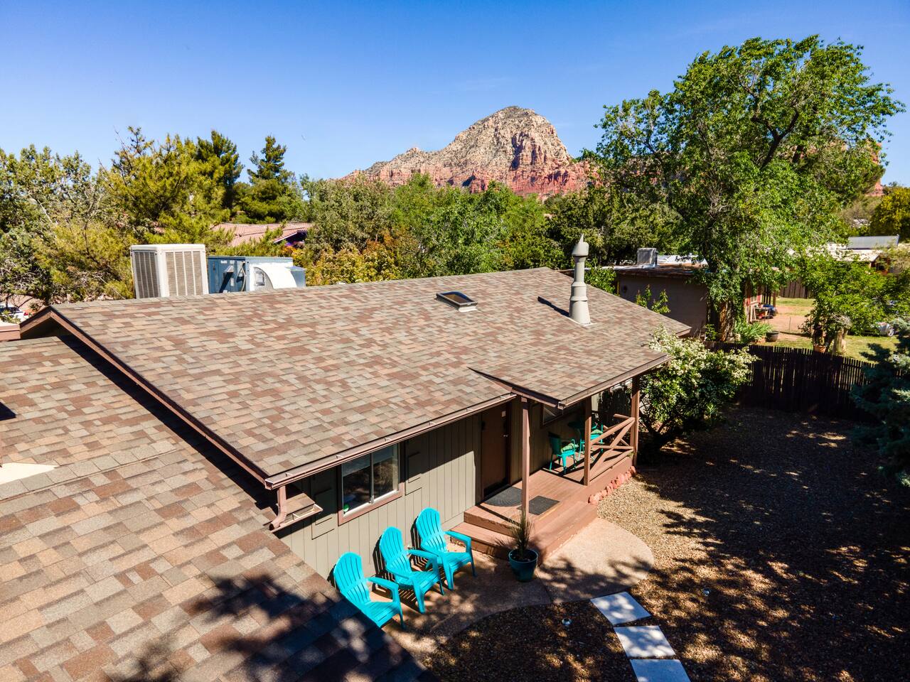 Relax, regroup and enjoy friends and family in this magical, centrally located 3 bed 2 bath West Sedona home. Lounge in your private, expansive back yard with yoga hut, hammock, fire pit, BBQ grill and lots of outdoor seating. There is a large front yard with adirondack chairs and porch with table and chairs to enjoy your morning coffee/tea or afternoon libations. Two living areas (there are a couple steps down to the second living room) and a dining area to spread out while you're in the house. Open kitchen with every utensil you need to prepare your meals. (Walking distance to Whole Foods.) Large main suite bedroom has a private bathroom with a shower and stores a washer /dryer and a business station. There are a couple steps down to main suite bedroom from the second bedroom and a couple steps up to the main suite bathroom. Second bathroom has a large soaking tub (temperamental jets which are often challenging and at times impossible to turn on, but it is a nice deep tub!) and separate shower. All bedrooms have vanity/lighted makeup mirrors. Garage houses a ping pong table and lounge area. View of Thunder Mountain from the yard (not the best view especially when all the trees have leaves, but definitely within view).