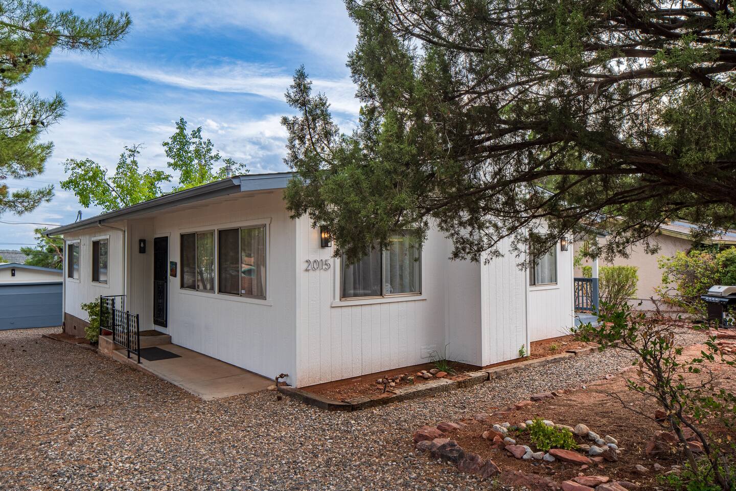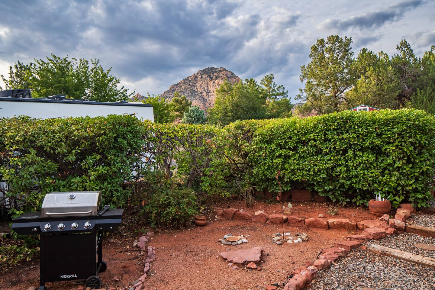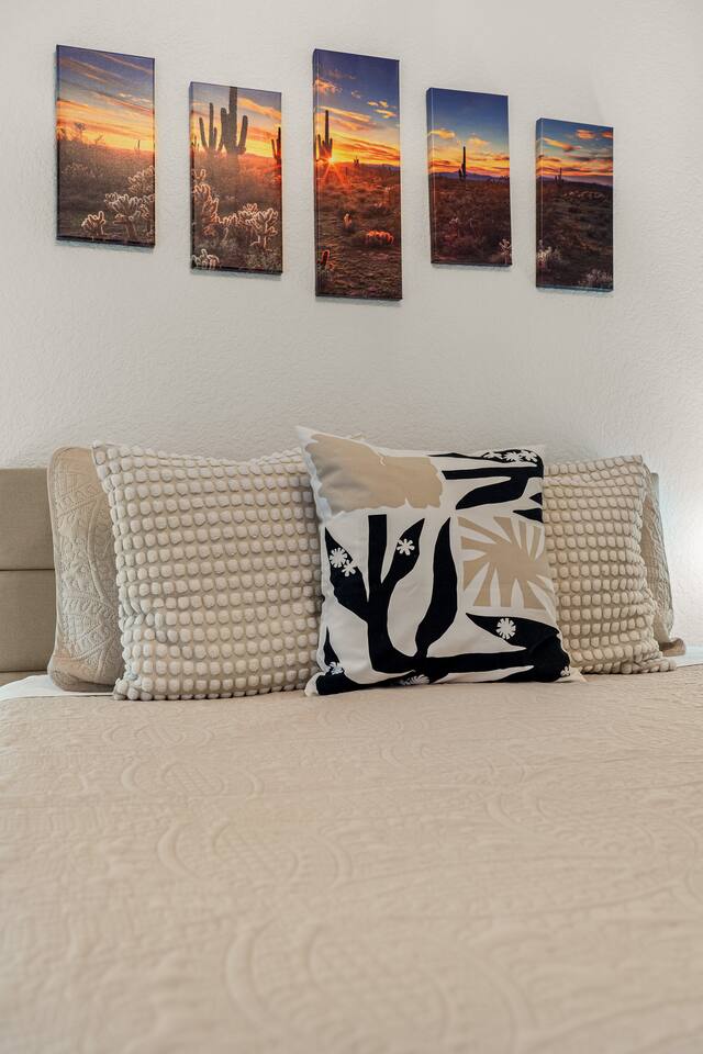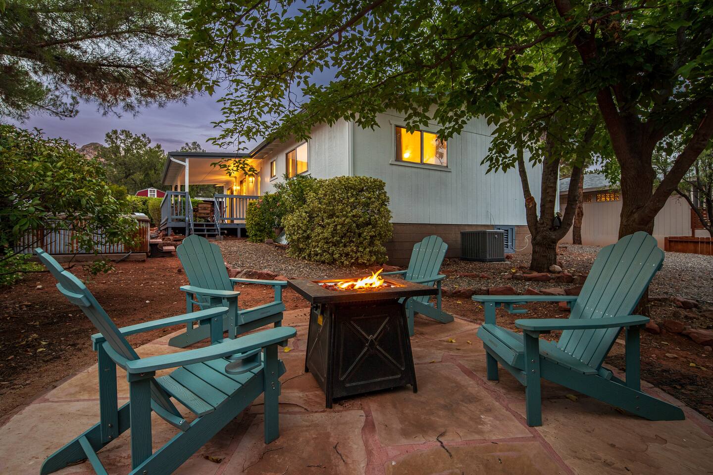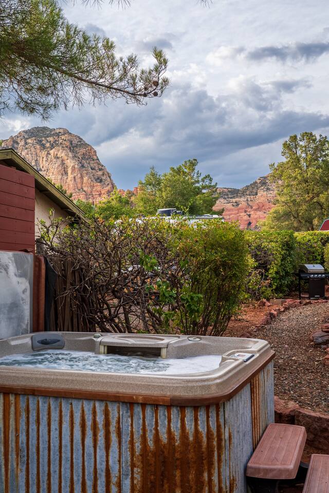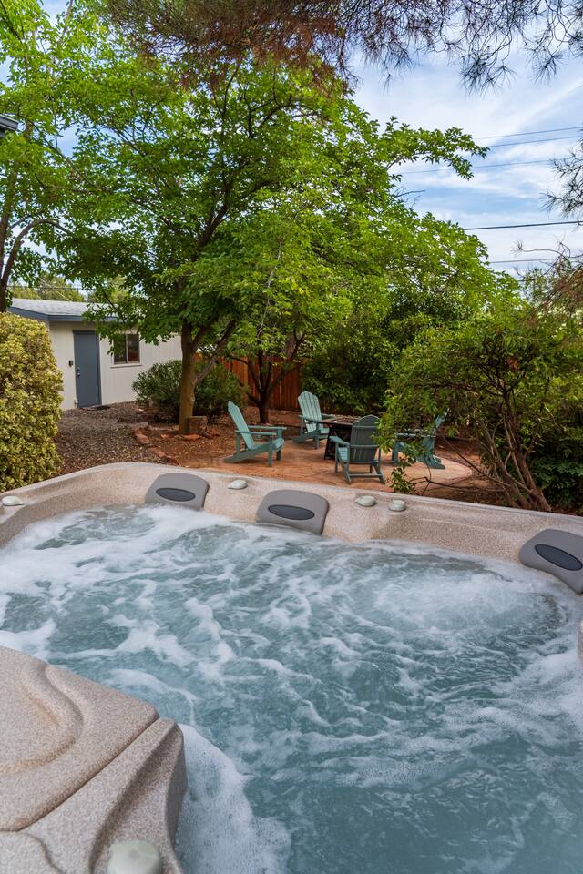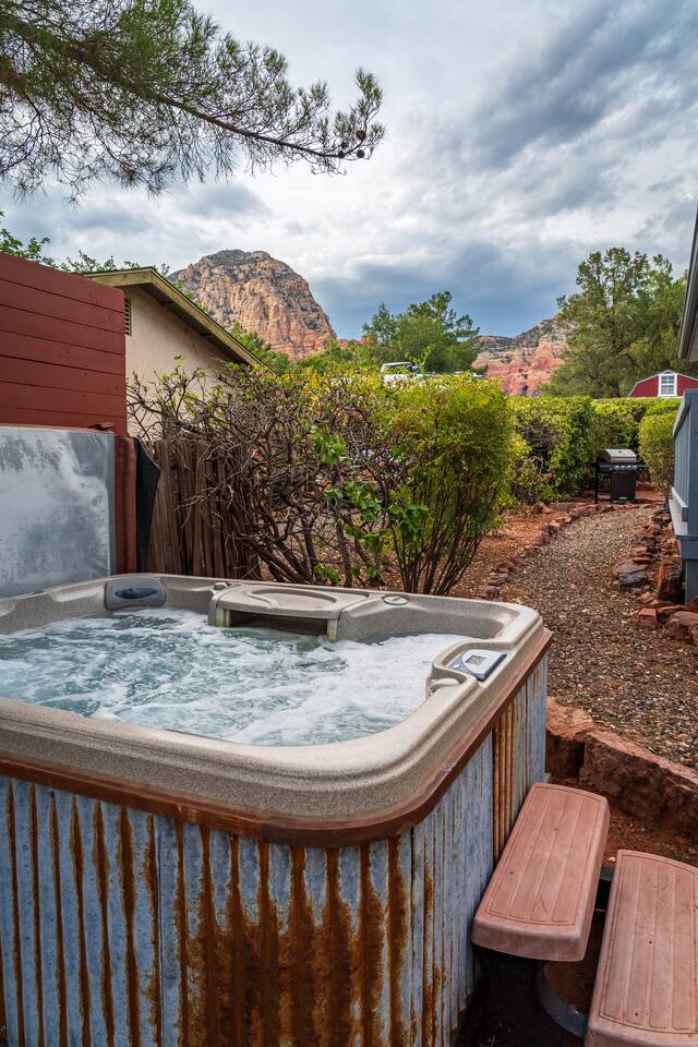 LIVING ROOM: - Open-concept layout with vaulted ceilings - 50" HDTV with standard cable - Wood-burning indoor fireplace - Ceiling fan & portable fans - Comfortable seating for family & friends - Living room sofa pulls out to a King size sleeper sofa KITCHEN: - LG refrigerator & Whirlpool stainless steel stove/oven - Dishwasher & microwave - Coffee maker (drip), hot water kettle, blender - Cooking basics (oil, salt, pepper), pots, pans, baking sheets - Dishware, wine glasses, toaster, and utensils - Dining table & BBQ utensils BEDROOM #1 (Primary Suite): - Comfortable King size bed with premium cotton linens - En suite bathroom for privacy - Clothing storage: dresser, wardrobe, and closet - Extra pillows and blankets BEDROOM #2: - Cozy Queen size bed with cotton & Egyptian cotton linens - Closet and dresser for storage - Located off main hallway BEDROOM #3: - Comfortable Queen size bed and quality linens - Closet space and dresser - Shares hall bathroom BATHROOM #1 (Shared Hall): - Full bath with hot water - Towels, toilet paper, soap, and shower gel - New sink and faucet upgrades BATHROOM #2 (En Suite): - Private master bath - Fresh linens and cleaning products - Granite countertops & updated fixtures OUTSIDE: - Spacious private backyard (not fully fenced) - Propane fire pit with flagstone seating area - Covered patio with outdoor dining area - BBQ grill, outdoor furniture & sun loungers - Scenic Thunder Mountain views - Hot tub with amazing Mountain View’s WELLNESS: - Massage chair: Get a relaxing massage after your hike - Red Light Therapy: May reduce inflammation and redness - Yoga mats and rollers to stretch and relax muscles FEATURES/AMENITIES: - Central heating & air conditioning - Hot tub - Free high-speed WiFi - Washer and dryer in unit - Self check-in with smart lock - Exterior security cameras for safety - Free driveway parking - Single-level home with no stairs - Board games and books - Dedicated workspace in private room NEARBY > Sedona Golf Resort (~1 mi) Picturesque 18-hole course offering sweeping red rock views and a relaxing golf experience. > Bell Rock (~2 mi) Distinctive red sandstone formation ideal for hiking, biking, and vortex energy exploration. > Courthouse Butte Loop Trail (~2 mi) Scenic 4-mile trail circling Courthouse Butte with moderate terrain and striking views. > Chapel of the Holy Cross (~5 mi) Iconic church built into the red rocks, known for its dramatic architecture and peaceful setting. > Cathedral Rock (~6 mi) Famous rock formation offering short but steep hikes and panoramic views from the summit. > Tlaquepaque Arts & Shopping Village (~6 mi) Artistic village with galleries, craft shops, and restaurants in a quaint, Spanish-style environment. > Sedona Heritage Museum (~7 mi) Museum preserving Sedona’s pioneer history with exhibits on local life and culture. > Amitabha Stupa and Peace Park (~8 mi) Spiritual site with a Buddhist stupa, walking paths, and spaces for meditation. > Red Rock State Park (~12 mi) Scenic nature park with trails, wildlife viewing, and ranger-led educational programs. > Slide Rock State Park (~13 mi) Natural rock water slide and swimming area set in Oak Creek Canyon’s beautiful landscape. > Montezuma Castle National Monument (~23 mi) Remarkably preserved cliff dwellings built into limestone cliffs by the Sinagua people. > Jerome Historic District (~29 mi) Charming hillside town with a colorful mining past, now home to unique shops, art galleries, and eateries.
