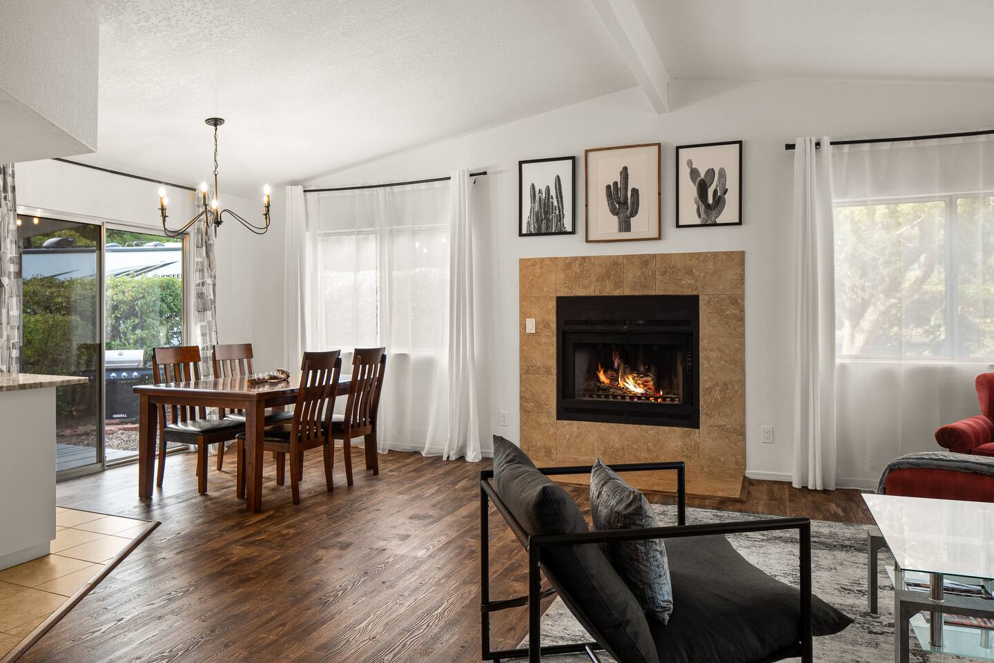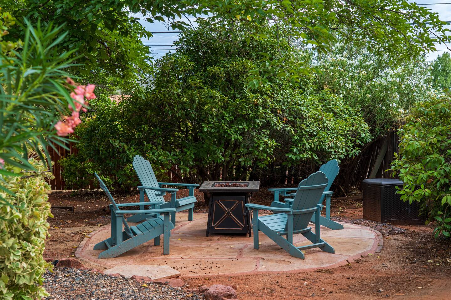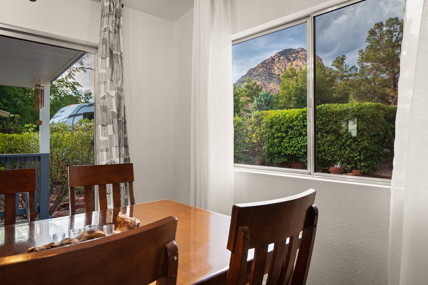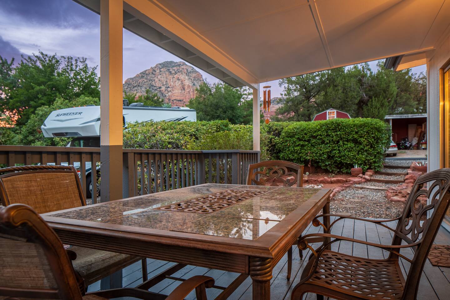 LIVING ROOM: - Open-concept layout with vaulted ceilings - 50" HDTV with standard cable - Wood-burning indoor fireplace - Ceiling fan & portable fans - Comfortable seating for family & friends - Living room sofa pulls out to a King size sleeper sofa KITCHEN: - LG refrigerator & Whirlpool stainless steel stove/oven - Dishwasher & microwave - Coffee maker (drip), hot water kettle, blender - Cooking basics (oil, salt, pepper), pots, pans, baking sheets - Dishware, wine glasses, toaster, and utensils - Dining table & BBQ utensils BEDROOM #1 (Primary Suite): - Comfortable King size bed with premium cotton linens - En suite bathroom for privacy - Clothing storage: dresser, wardrobe, and closet - Extra pillows and blankets BEDROOM #2: - Cozy Queen size bed with cotton & Egyptian cotton linens - Closet and dresser for storage - Located off main hallway BEDROOM #3: - Comfortable Queen size bed and quality linens - Closet space and dresser - Shares hall bathroom BATHROOM #1 (Shared Hall): - Full bath with hot water - Towels, toilet paper, soap, and shower gel - New sink and faucet upgrades BATHROOM #2 (En Suite): - Private master bath - Fresh linens and cleaning products - Granite countertops & updated fixtures OUTSIDE: - Spacious private backyard (not fully fenced) - Propane fire pit with flagstone seating area - Covered patio with outdoor dining area - BBQ grill, outdoor furniture & sun loungers - Scenic Thunder Mountain views - Hot tub with amazing Mountain View’s WELLNESS: - Massage chair: Get a relaxing massage after your hike - Red Light Therapy: May reduce inflammation and redness - Yoga mats and rollers to stretch and relax muscles FEATURES/AMENITIES: - Central heating & air conditioning - Hot tub - Free high-speed WiFi - Washer and dryer in unit - Self check-in with smart lock - Exterior security cameras for safety - Free driveway parking - Single-level home with no stairs - Board games and books - Dedicated workspace in private room NEARBY > Sedona Golf Resort (~1 mi) Picturesque 18-hole course offering sweeping red rock views and a relaxing golf experience. > Bell Rock (~2 mi) Distinctive red sandstone formation ideal for hiking, biking, and vortex energy exploration. > Courthouse Butte Loop Trail (~2 mi) Scenic 4-mile trail circling Courthouse Butte with moderate terrain and striking views. > Chapel of the Holy Cross (~5 mi) Iconic church built into the red rocks, known for its dramatic architecture and peaceful setting. > Cathedral Rock (~6 mi) Famous rock formation offering short but steep hikes and panoramic views from the summit. > Tlaquepaque Arts & Shopping Village (~6 mi) Artistic village with galleries, craft shops, and restaurants in a quaint, Spanish-style environment. > Sedona Heritage Museum (~7 mi) Museum preserving Sedona’s pioneer history with exhibits on local life and culture. > Amitabha Stupa and Peace Park (~8 mi) Spiritual site with a Buddhist stupa, walking paths, and spaces for meditation. > Red Rock State Park (~12 mi) Scenic nature park with trails, wildlife viewing, and ranger-led educational programs. > Slide Rock State Park (~13 mi) Natural rock water slide and swimming area set in Oak Creek Canyon’s beautiful landscape. > Montezuma Castle National Monument (~23 mi) Remarkably preserved cliff dwellings built into limestone cliffs by the Sinagua people. > Jerome Historic District (~29 mi) Charming hillside town with a colorful mining past, now home to unique shops, art galleries, and eateries.