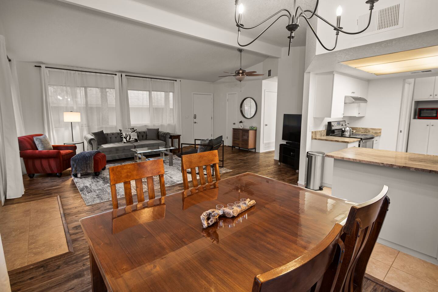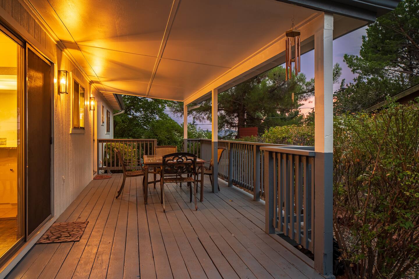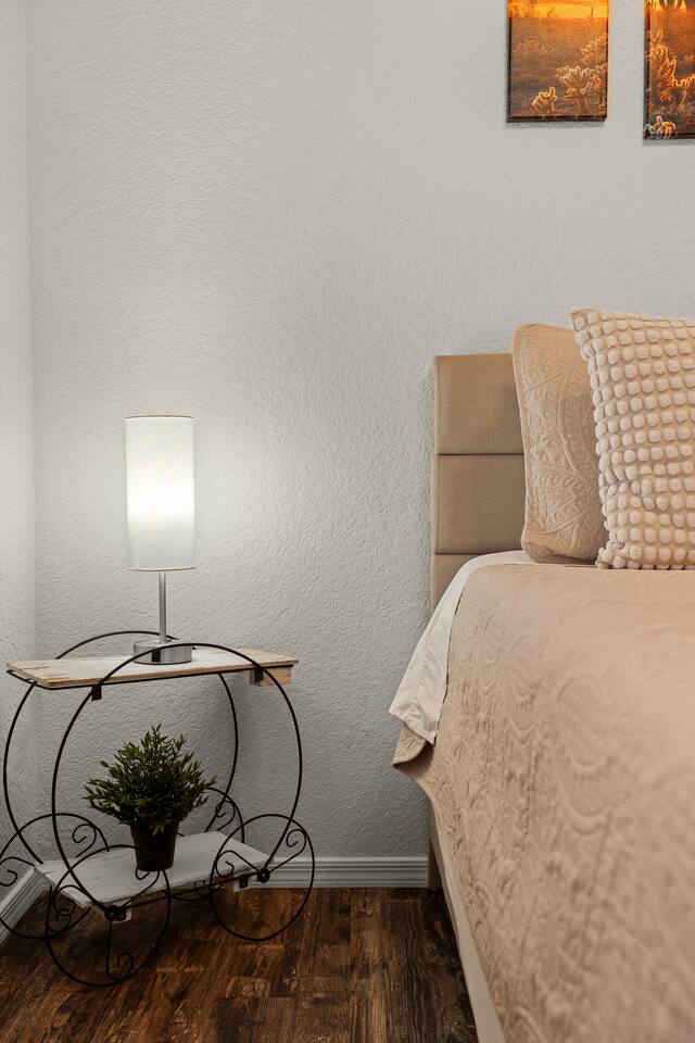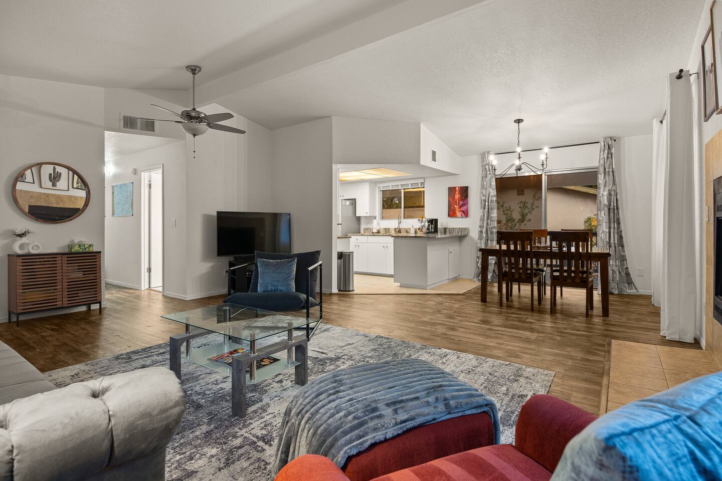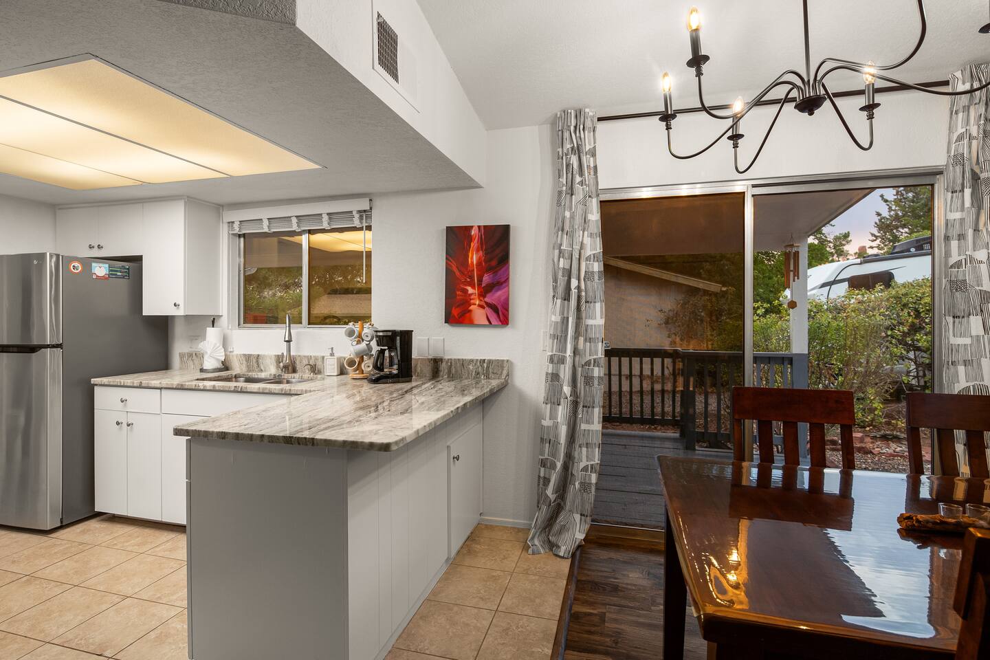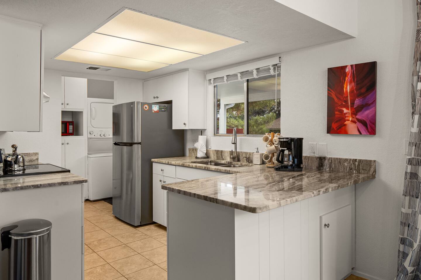 LIVING ROOM: - Open-concept layout with vaulted ceilings - 50" HDTV with standard cable - Wood-burning indoor fireplace - Ceiling fan & portable fans - Comfortable seating for family & friends - Living room sofa pulls out to a King size sleeper sofa KITCHEN: - LG refrigerator & Whirlpool stainless steel stove/oven - Dishwasher & microwave - Coffee maker (drip), hot water kettle, blender - Cooking basics (oil, salt, pepper), pots, pans, baking sheets - Dishware, wine glasses, toaster, and utensils - Dining table & BBQ utensils BEDROOM #1 (Primary Suite): - Comfortable King size bed with premium cotton linens - En suite bathroom for privacy - Clothing storage: dresser, wardrobe, and closet - Extra pillows and blankets BEDROOM #2: - Cozy Queen size bed with cotton & Egyptian cotton linens - Closet and dresser for storage - Located off main hallway BEDROOM #3: - Comfortable Queen size bed and quality linens - Closet space and dresser - Shares hall bathroom BATHROOM #1 (Shared Hall): - Full bath with hot water - Towels, toilet paper, soap, and shower gel - New sink and faucet upgrades BATHROOM #2 (En Suite): - Private master bath - Fresh linens and cleaning products - Granite countertops & updated fixtures OUTSIDE: - Spacious private backyard (not fully fenced) - Propane fire pit with flagstone seating area - Covered patio with outdoor dining area - BBQ grill, outdoor furniture & sun loungers - Scenic Thunder Mountain views - Hot tub with amazing Mountain View’s WELLNESS: - Massage chair: Get a relaxing massage after your hike - Red Light Therapy: May reduce inflammation and redness - Yoga mats and rollers to stretch and relax muscles FEATURES/AMENITIES: - Central heating & air conditioning - Hot tub - Free high-speed WiFi - Washer and dryer in unit - Self check-in with smart lock - Exterior security cameras for safety - Free driveway parking - Single-level home with no stairs - Board games and books - Dedicated workspace in private room NEARBY > Sedona Golf Resort (~1 mi) Picturesque 18-hole course offering sweeping red rock views and a relaxing golf experience. > Bell Rock (~2 mi) Distinctive red sandstone formation ideal for hiking, biking, and vortex energy exploration. > Courthouse Butte Loop Trail (~2 mi) Scenic 4-mile trail circling Courthouse Butte with moderate terrain and striking views. > Chapel of the Holy Cross (~5 mi) Iconic church built into the red rocks, known for its dramatic architecture and peaceful setting. > Cathedral Rock (~6 mi) Famous rock formation offering short but steep hikes and panoramic views from the summit. > Tlaquepaque Arts & Shopping Village (~6 mi) Artistic village with galleries, craft shops, and restaurants in a quaint, Spanish-style environment. > Sedona Heritage Museum (~7 mi) Museum preserving Sedona’s pioneer history with exhibits on local life and culture. > Amitabha Stupa and Peace Park (~8 mi) Spiritual site with a Buddhist stupa, walking paths, and spaces for meditation. > Red Rock State Park (~12 mi) Scenic nature park with trails, wildlife viewing, and ranger-led educational programs. > Slide Rock State Park (~13 mi) Natural rock water slide and swimming area set in Oak Creek Canyon’s beautiful landscape. > Montezuma Castle National Monument (~23 mi) Remarkably preserved cliff dwellings built into limestone cliffs by the Sinagua people. > Jerome Historic District (~29 mi) Charming hillside town with a colorful mining past, now home to unique shops, art galleries, and eateries.