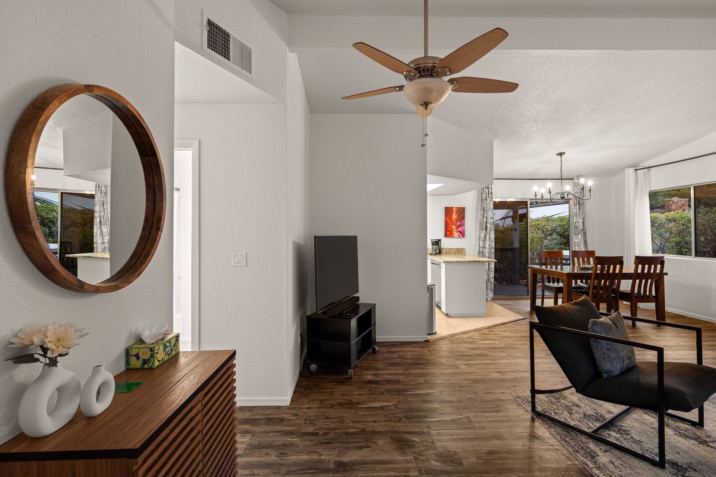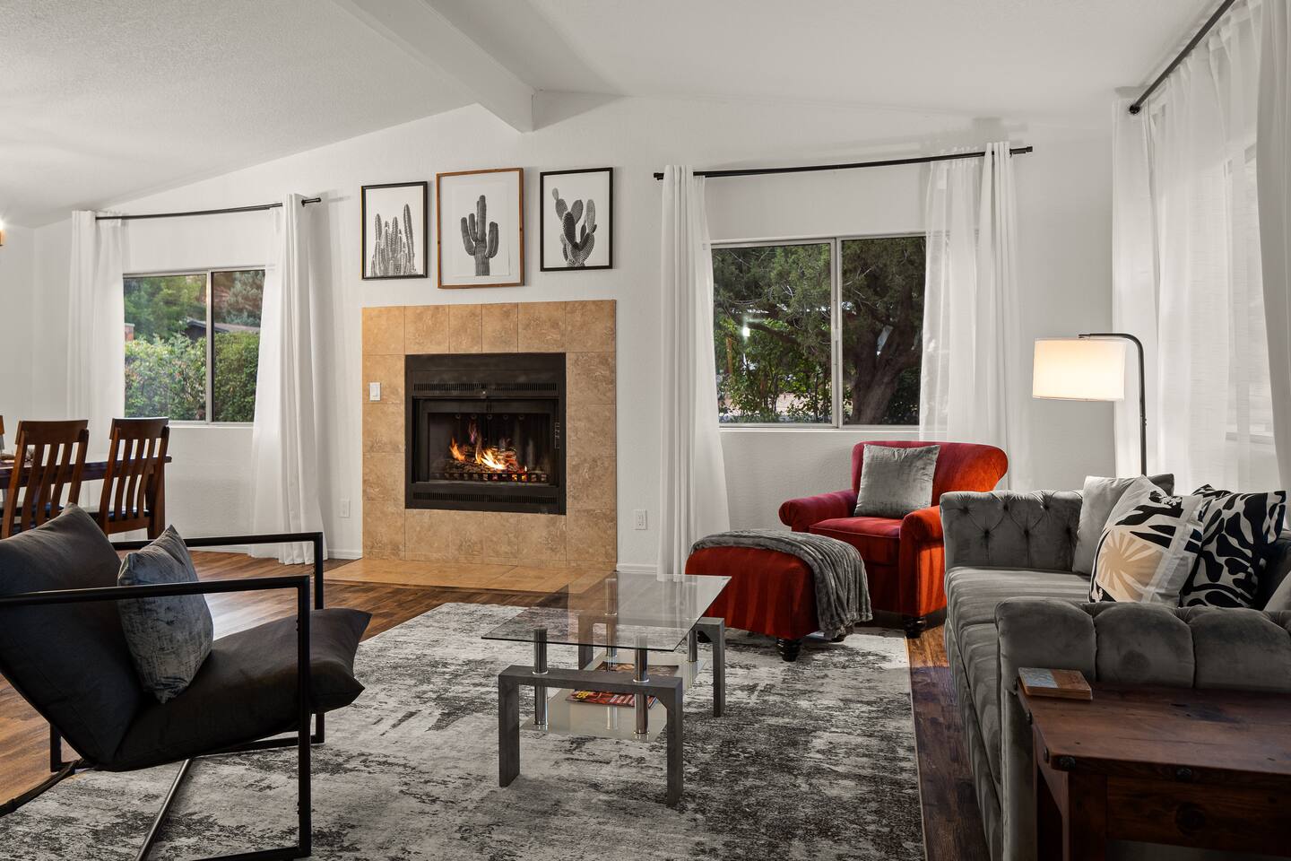 This beautifully updated Sedona home offers , majestic views of Thunder Mountain and Sugarloaf, a quiet neighborhood, and prime walkability to hiking trails, shopping, restaurants, and more. Ideal for families or small groups, enjoy the stylish open-concept design and outdoor living with a fire pit, BBQ, and covered dining area. The home features a wood-burning fireplace, dedicated workspace, central air, and premium linens. Convenient access to the Sedona Trolley and Verde Lynx bus system.